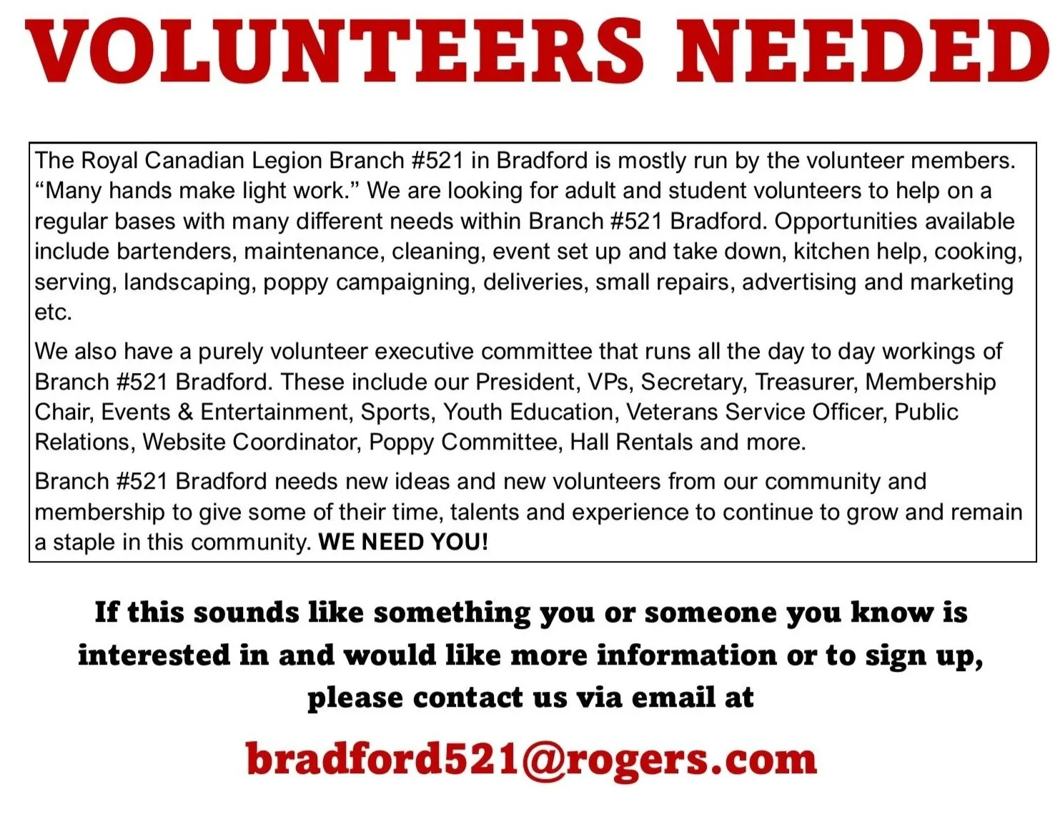 When you volunteer, you are doing good for others and the community, which provides a natural sense of accomplishment, pride and identity. The more we give, the happier we feel. Volunteer today—give us a call at 905-775-5025 or email bradford521@rogers.com